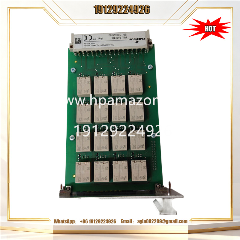 The EMERSON A6740-10 is a 16-channel output relay module designed for AMS 6500 machinery health systems, compliant with API 670 standards, featuring hot-swappable functionality and programmable logic to provide reliable alarm and control signal switching for critical rotating industrial machinery.